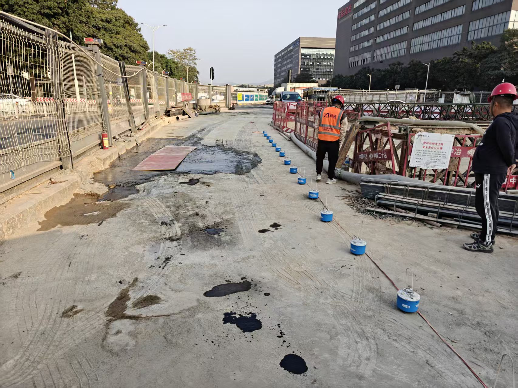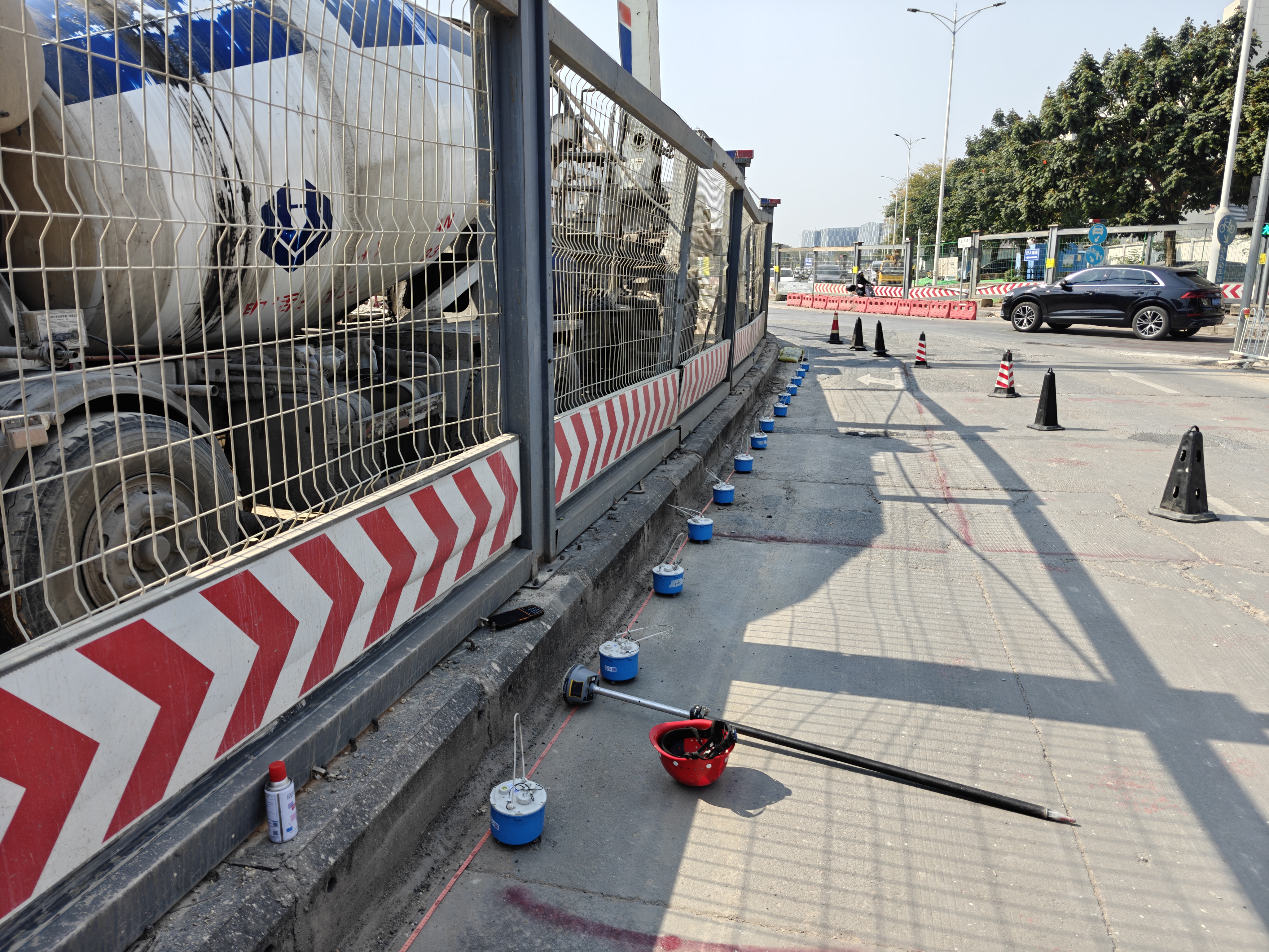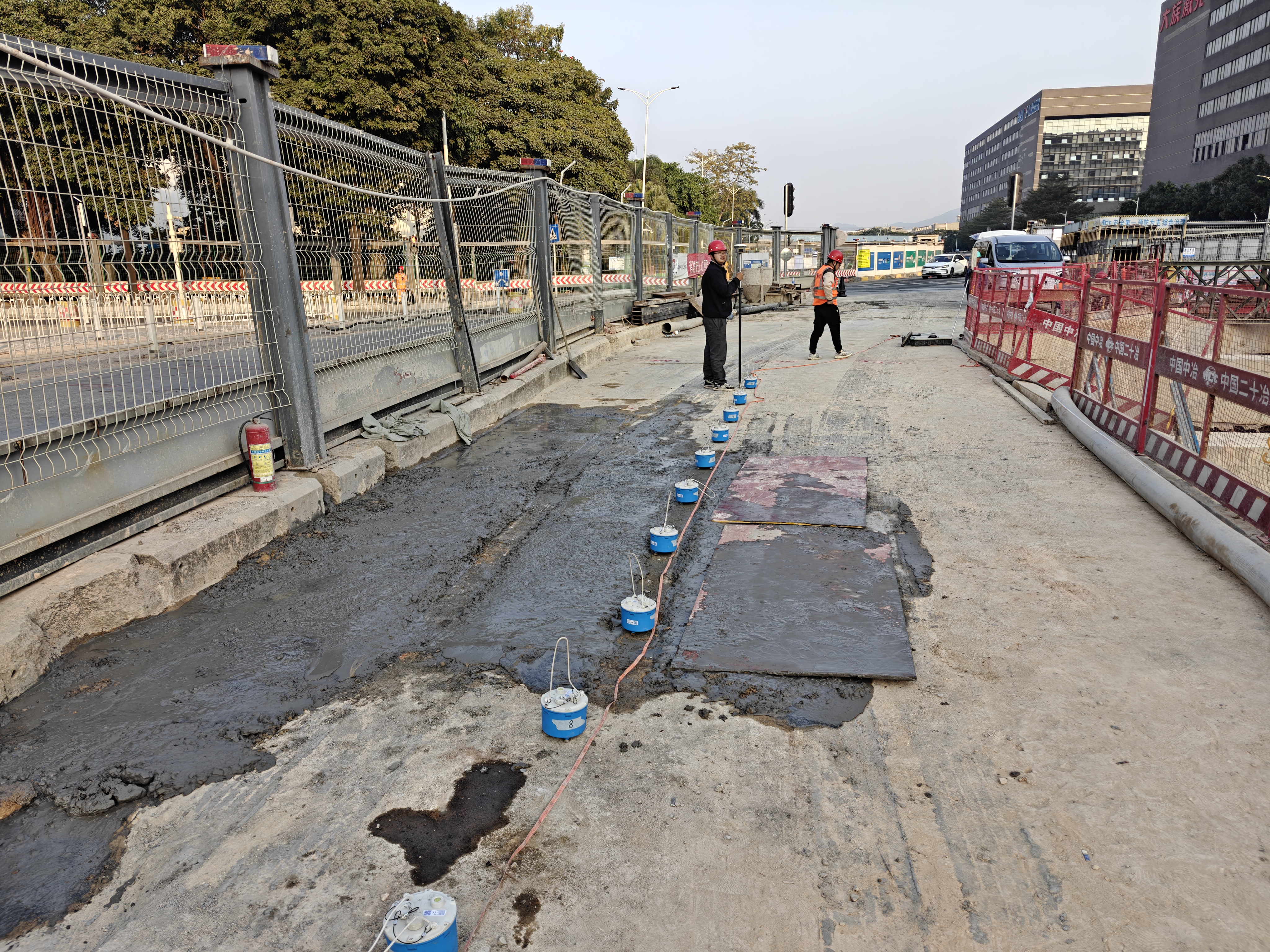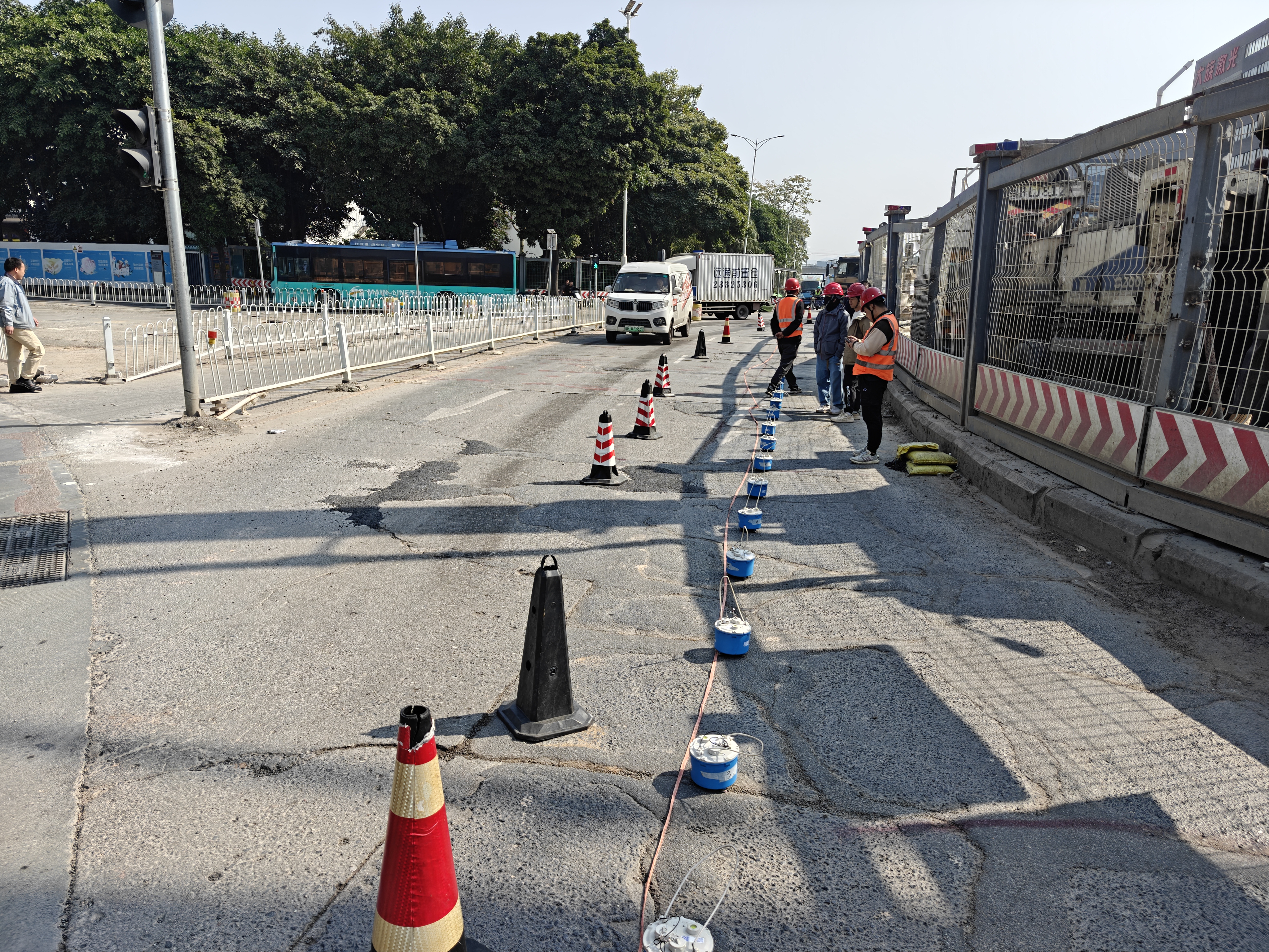 重庆路西延段(展览大道-松福大道)与福园一路交叉口,k1+057-k1+067段,北侧有一处现状雨水检查井,因现状雨水检查井(旧井)渗漏,井室内雨污水沿基坑外侧土进入基坑内,原DN2000污水管道上方为吊脚桩,下部无止水桩,渗漏的雨水含着泥土进入管廊基坑内,导致基坑外侧(后期路基下)出现大面水土流失,因未知地下水土流失造成空洞的面积和位置,为防止后期道路建设路基空洞造成较大安全隐患,现对其预估空洞范围进行地质空洞探测,以便对其进行注浆加固和修复。