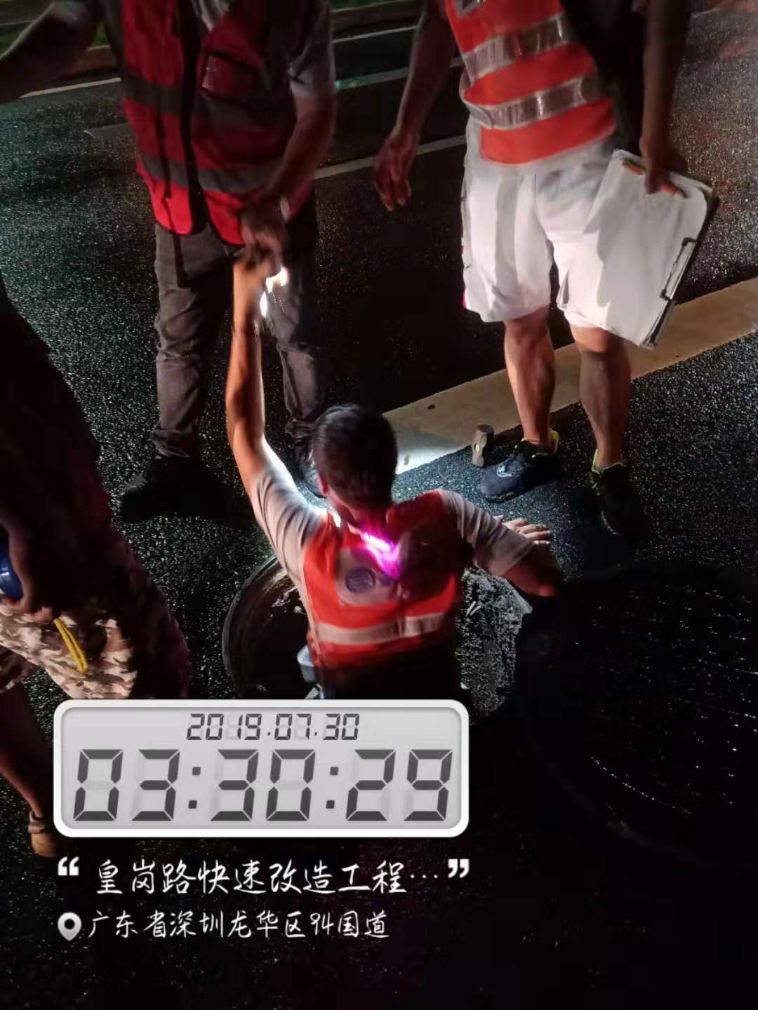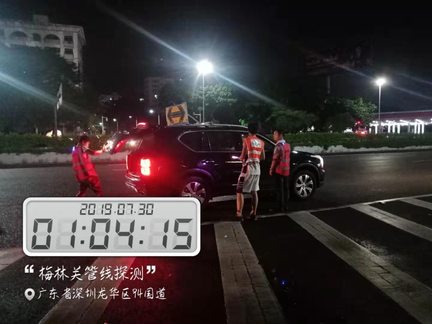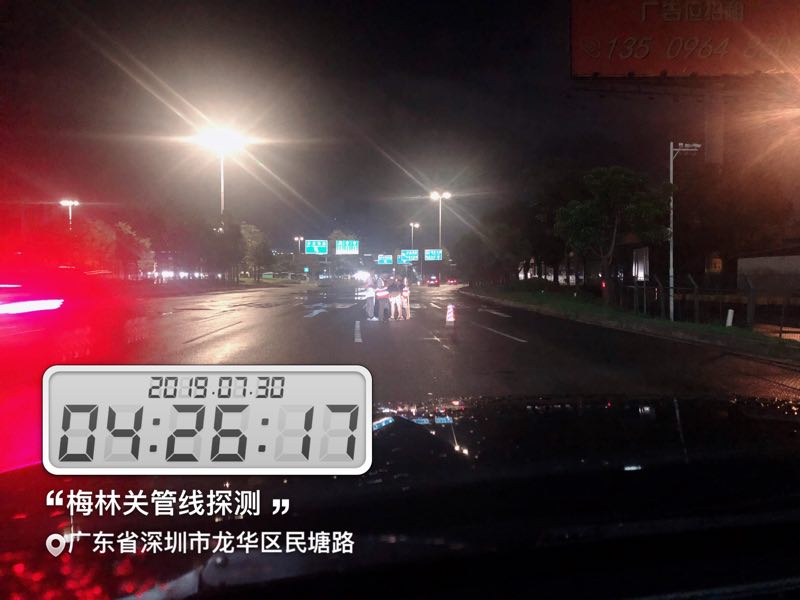 2019年7月29日晚12点,我跟随我司管线部技术人员,前往皇岗路梅林关作业区。由于梅林关路段路面较窄,主车道白天车流量很大,无法进行探测。经过一段时间的准备,我司于进行夜间作业,集中解决主车道上的管线探测问题。