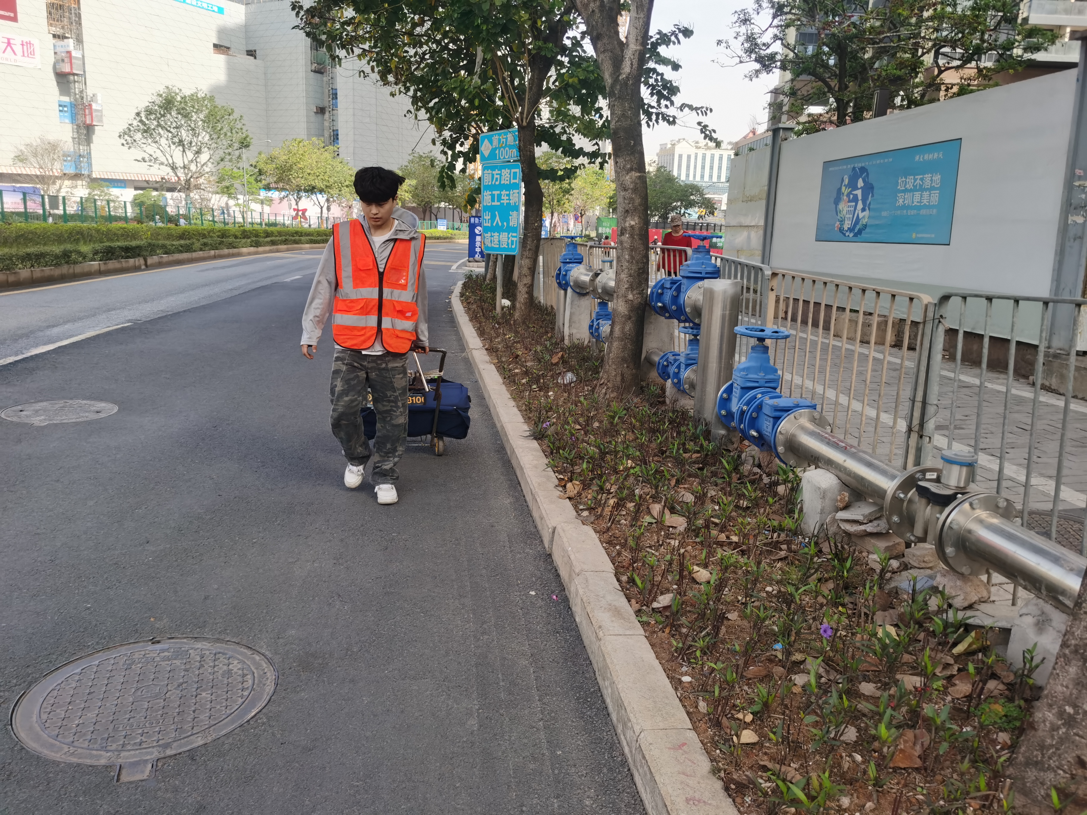 测区位于深圳市龙华区观澜街道平安路与景祥路交汇处,探测范围由委托方现场指定,测区整体成T状,面积约2700平方米。范围内主要为平安路人行道及景祥路人行道,通视条件良好,地势起伏变化不大。现状管线主要敷设于道路两侧,以通信、电力、给水和排水管为主,各类管道相互穿插,埋设极不规律;测区内管线种类7种,每公里平均定位点大于20点,属地下管线探测复杂程度中等地区。