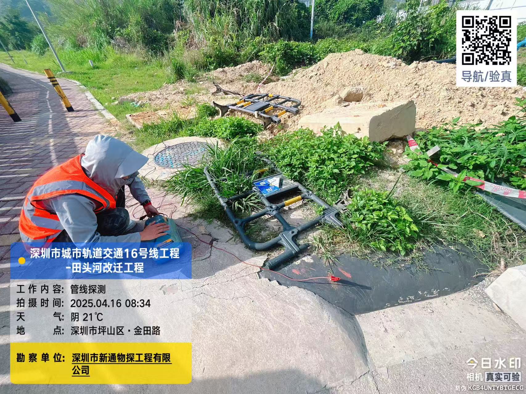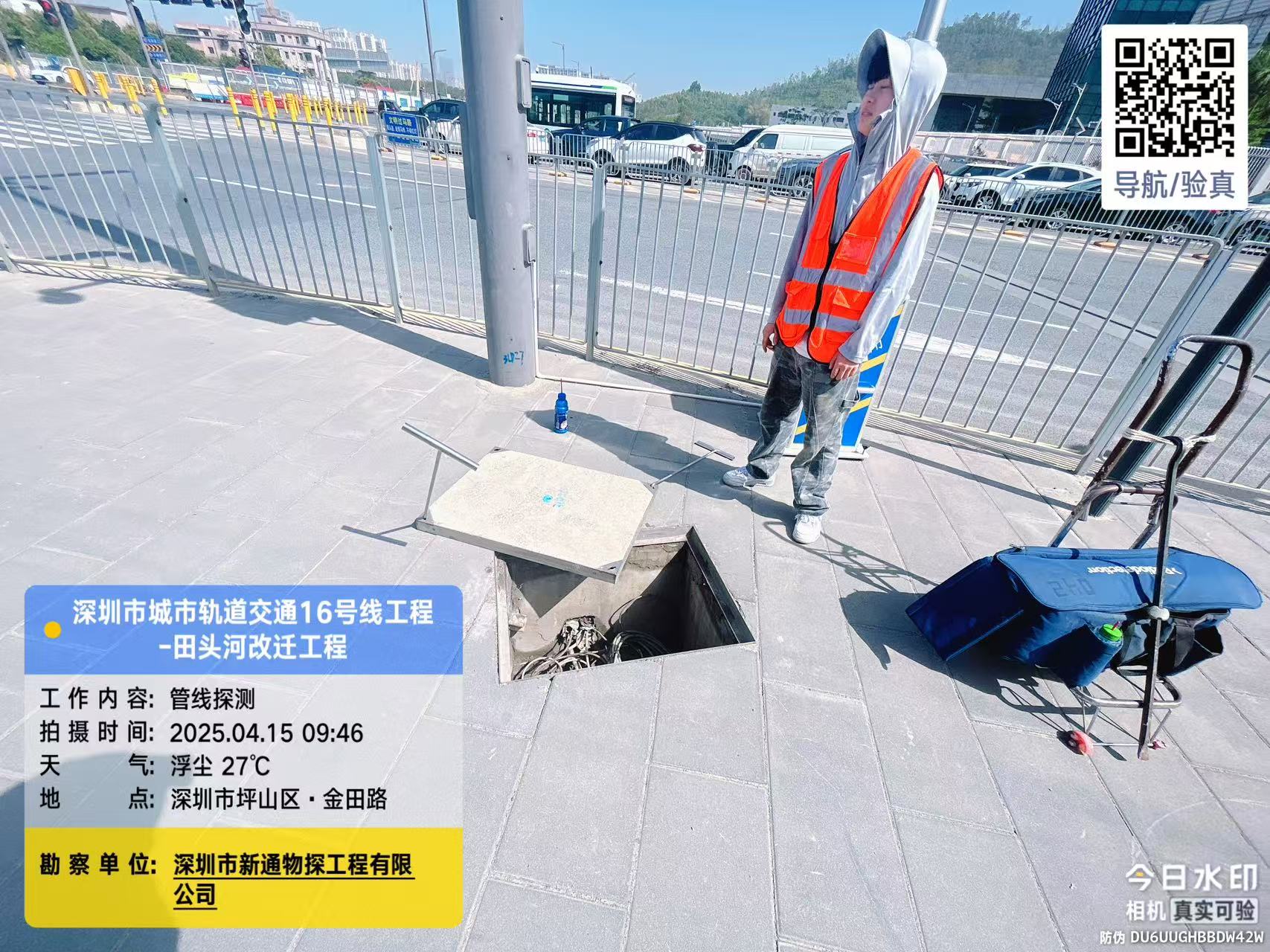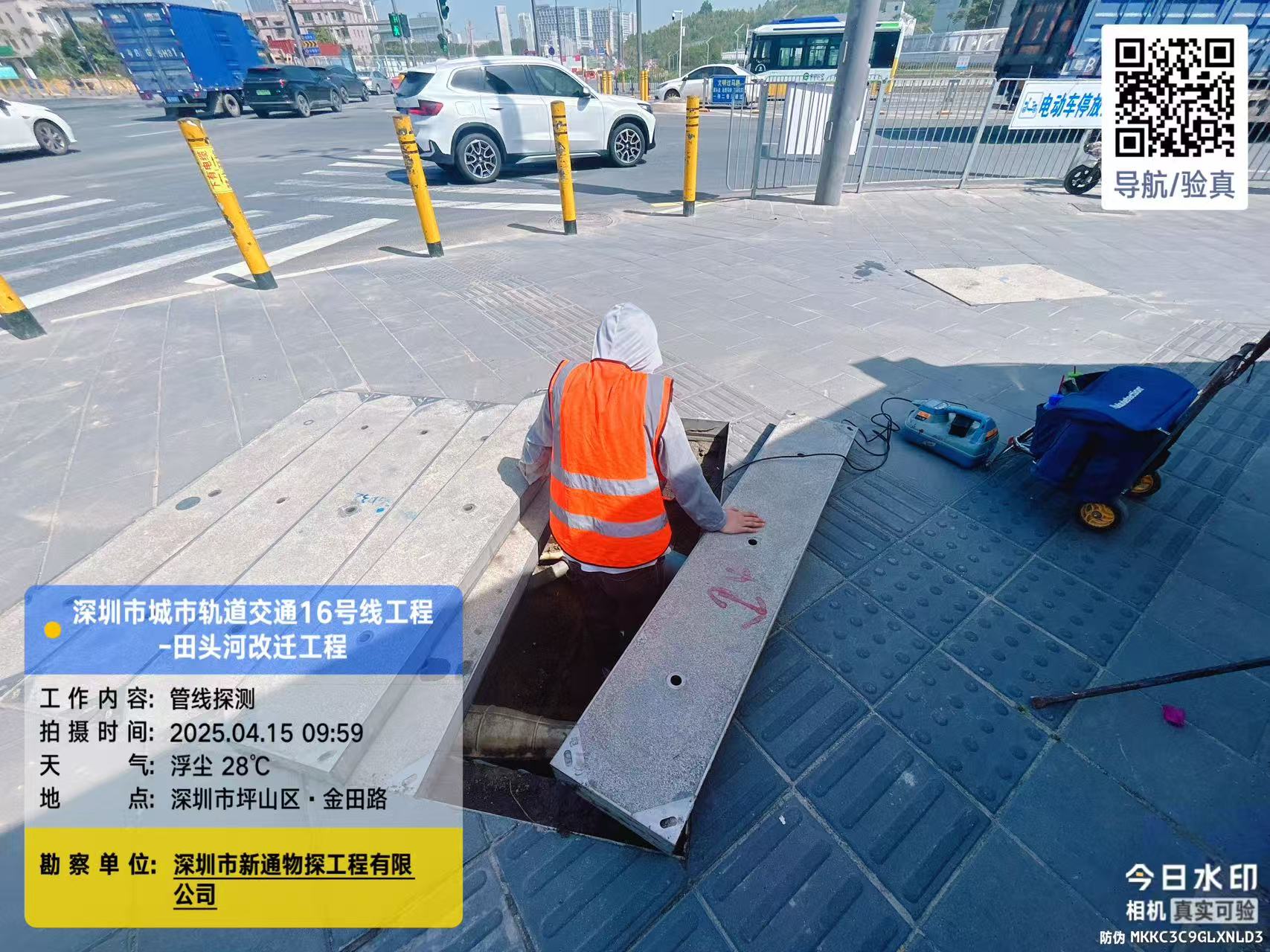 测区位于深圳市坪山区聚龙路与金田路东侧交汇处,探测范围由委托方提供电子版红线及现场指定为准,测区整体成带状,面积约3100平方米。范围内主要为聚龙路人行道与金田路车道,地势起伏变化不大,通视条件良好。管线主要敷设于人行道及绿化带内,以通信、电力、给水和排水管为主,各类管道相互穿插,埋设极不规律;测区内管线种类7种,每公里平均定位点大于20点,属地下管线探测中等复杂程度地区。