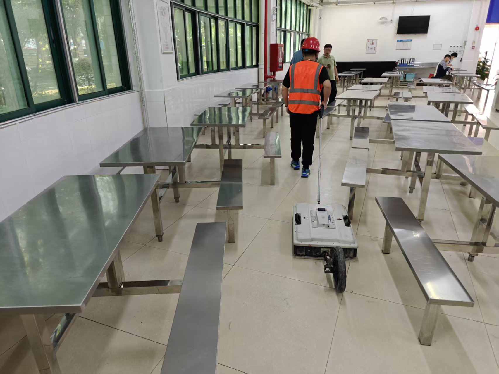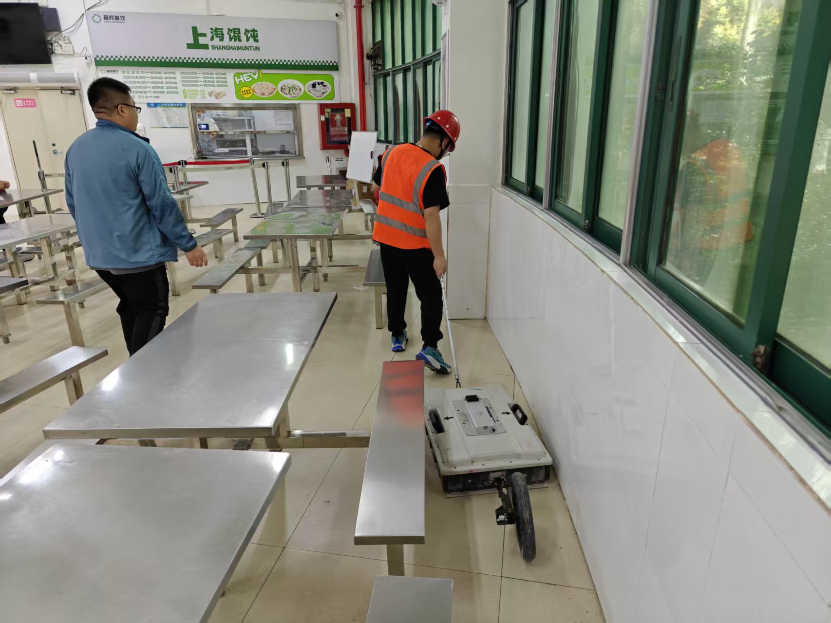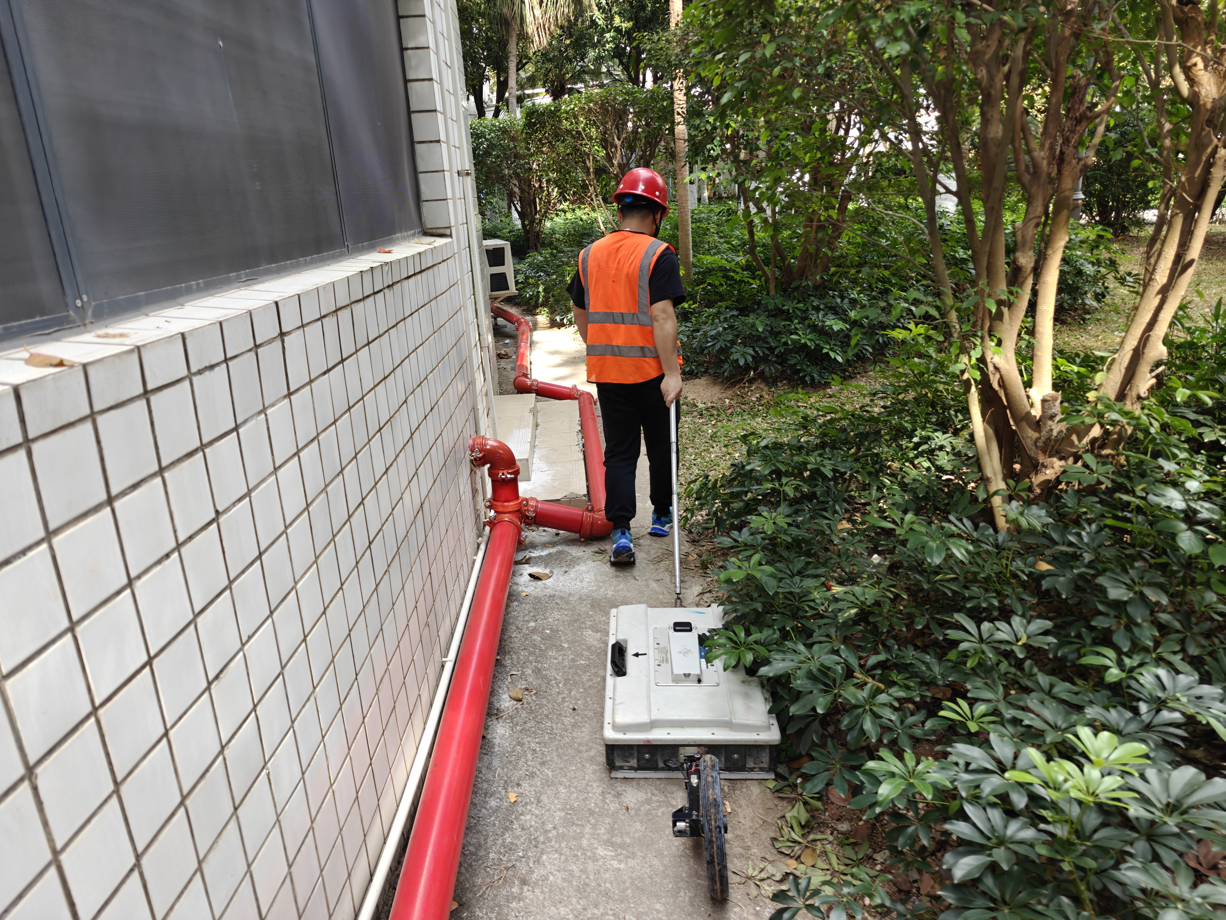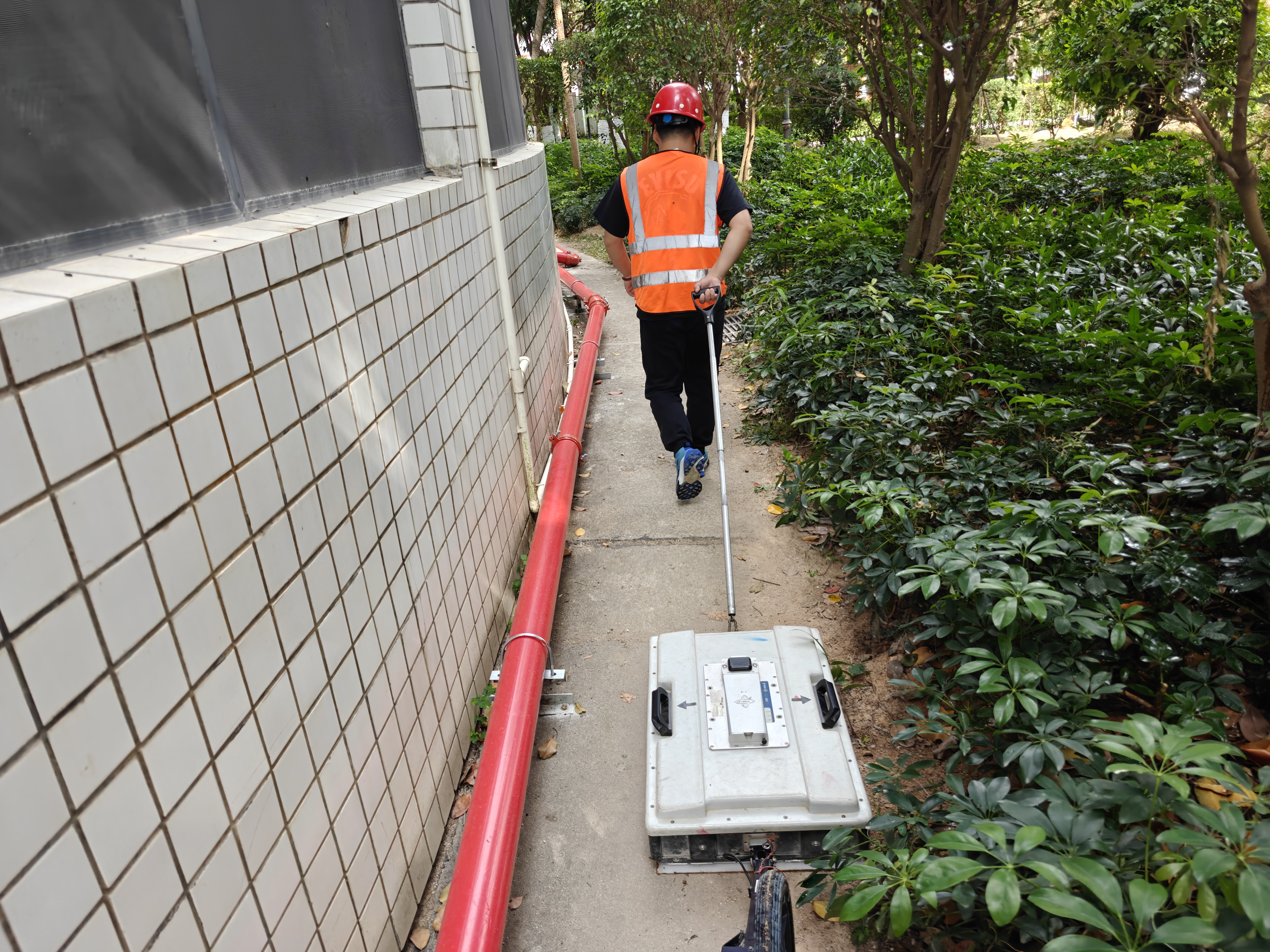 深圳鹏城技师学院(侨城校区)食堂消防水管下方听见异常水流声音,推测为消防水管破损,水流因水压力过大冲刷地下土体,可能造成空洞等情况。我公司承担了深圳鹏城技师学院(侨城校区)地质雷达探测任务,工作目的是查明深圳鹏城技师学院(侨城校区)食堂消防水管下方是否存在空洞等隐患。