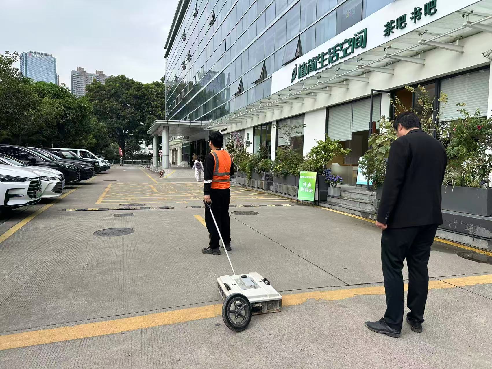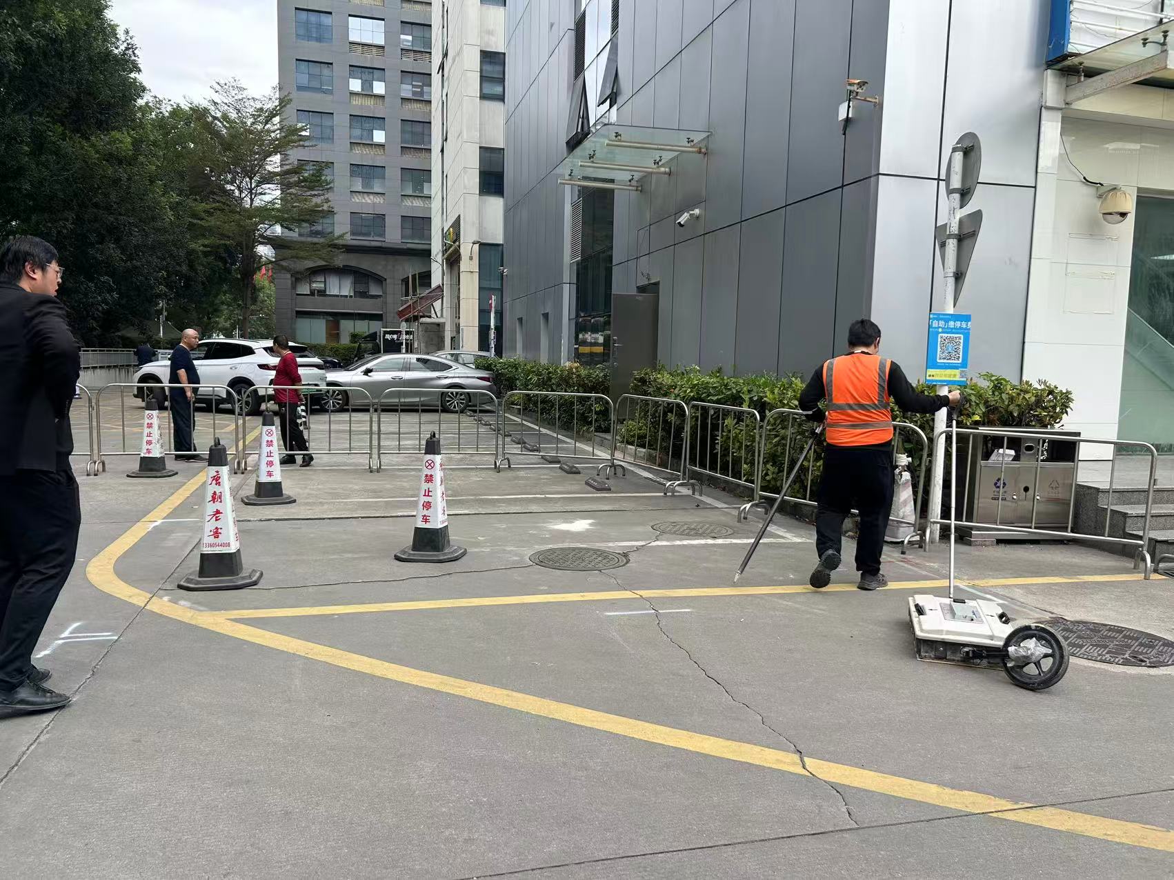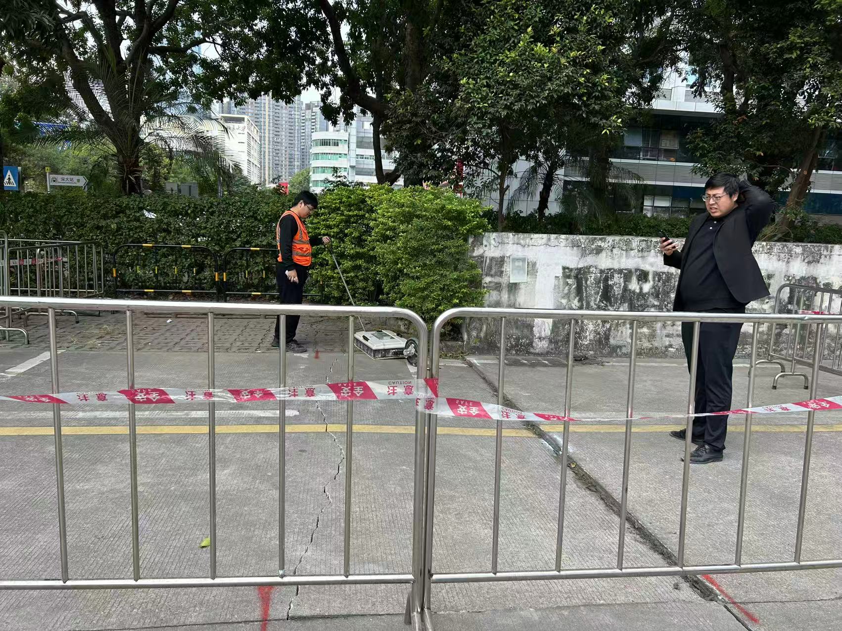 受中委托,我公司承担了南山区沙河高新南七道惠恒大厦停车场及周边市政、人行道路地面下方浅部的地下空洞、疏松等地质隐患体的地质雷达探测任务。工作目的是查明南山区沙河高新南七道惠恒大厦停车场西南角地面开裂、沉降区域是否存有空洞、脱空、疏松等隐患体,为后期地质隐患治理提供参考依据。